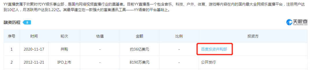 據天眼查APP顯示,百度併購YY直播的金額高達36億美元,這是百度自成立以來最大手筆的併購案,如此大的手筆足以表明百度對於直播的重視。