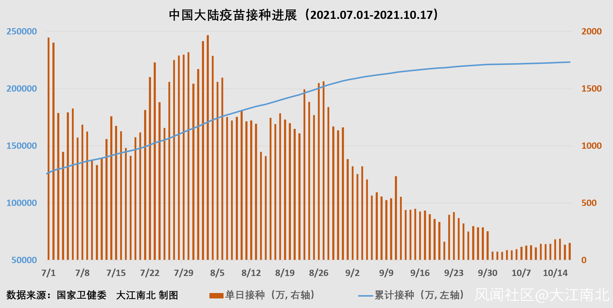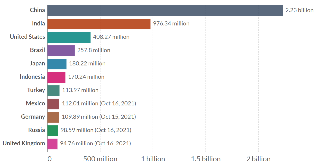 截止2021年10月17日,中國大陸累計接種新冠疫苗22.3209億劑,繼續位居全球第一位,佔全球累計接種劑數的33.4%;其中單日新增接種152萬劑,佔全球單日接種劑數的11.2%。中國每百人累計接種158.10劑,環比增加0.10劑,是美國的1.30倍,位居世界主要大國之首。