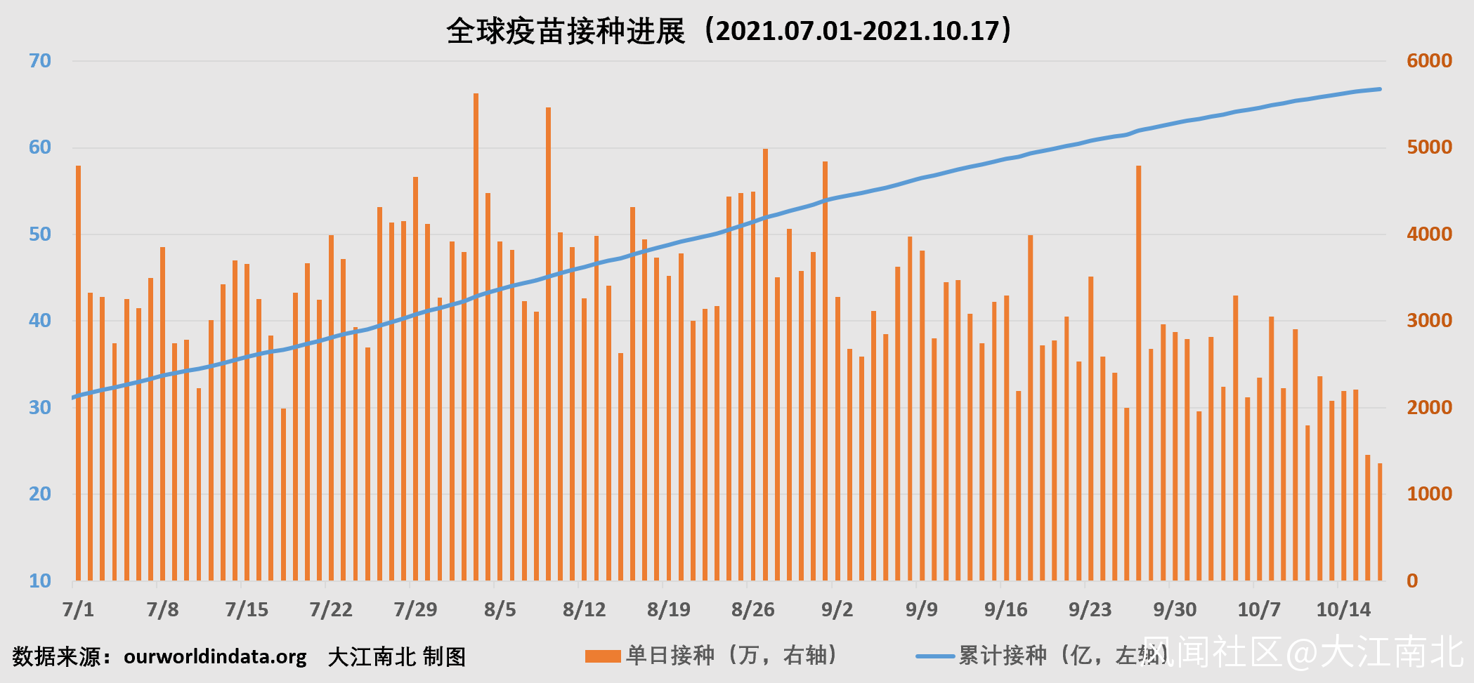 截止2021年10月17日,全球累計接種新冠疫苗66.7億劑;**其中單日接種1357萬劑,創5月2日以來新低;**平均每百人接種84.75劑,環比增加0.17劑。