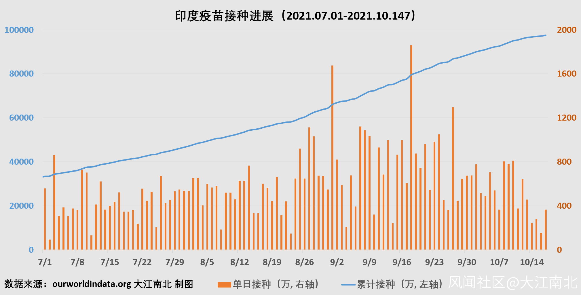 截止2021年10月17日,印度累計接種9.6835****億劑,列第二位,**其中單日新增接種365萬劑。**印度每百人累計接種70.07劑,是中國的44.3%。