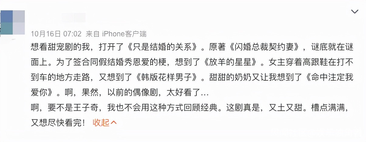 網絡端,古早甜寵劇所隱隱撬動的情懷,同樣是傳播利器。《結婚關係》被網友調侃為“低配版《放羊的星星》”,輿論中被提及的還有《天國的嫁衣》等偶像劇,而它們也在轉身成為新的傳播標籤。