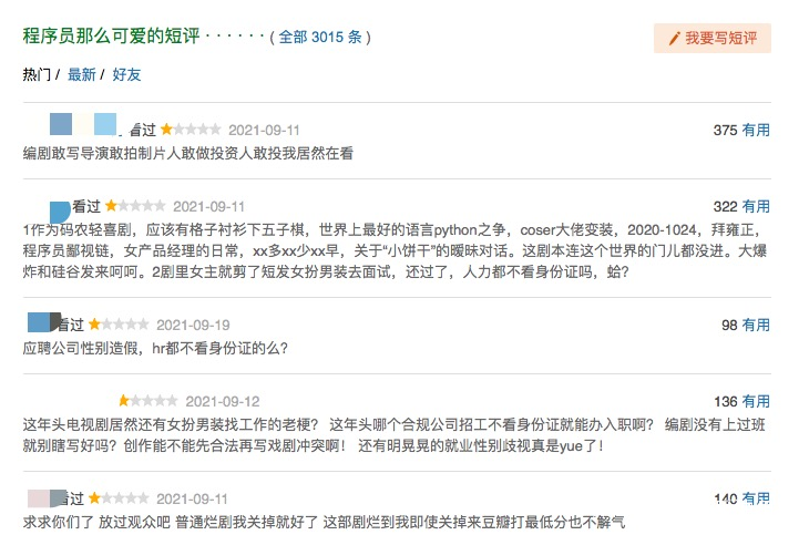 仍以《程序員》為例,在它的高贊短評中,有網友指出:“碼農輕喜劇,應該有格子襯衫下無五子棋;女主剪了短髮女扮男裝去面試,人力都不看身份證嗎?”女扮男裝本極具戲劇張力,但同樣需要找到適合的土壤才能生根發芽,而程序員的社畜聚焦更需要從業者用心感知和臨摹。
