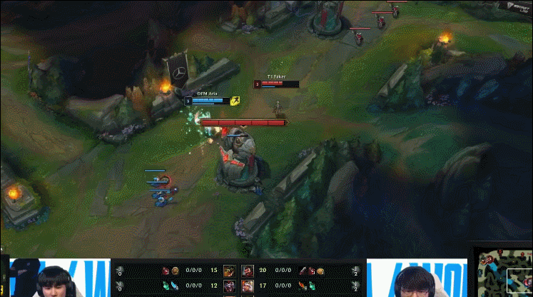 面對T1中的絕對靈魂人物Faker,Airia選出他的招牌英雄「暮光星靈」單殺了大魔王Faker,這是獨屬於DFM的高光時刻,是一段絕對精彩的show time。