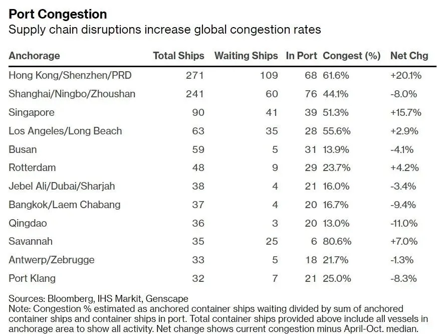作為休斯頓港的“鄰居”兼北美最大的集裝箱出口港,佐治亞州的薩凡納港也出現了史無前例的塞港現象。在岸口,近8萬個五顏六色的箱子,如從天而降的“俄羅斯方塊”,以各種不同的形式堆疊在一起,總數量比平時多了近一半。據彭博社統計,該港的擁堵率已累積高達80.6%,位居全球第一。
