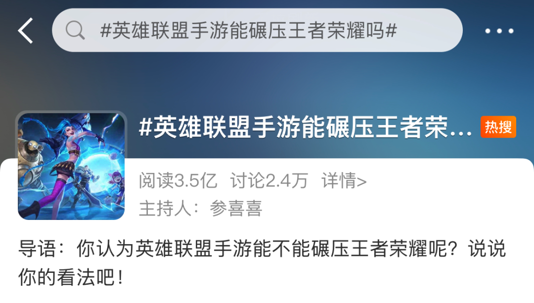 在微博上,#英雄聯盟手遊能碾壓王者榮耀#的相關話題已有閲讀3.5億,討論2.4萬。