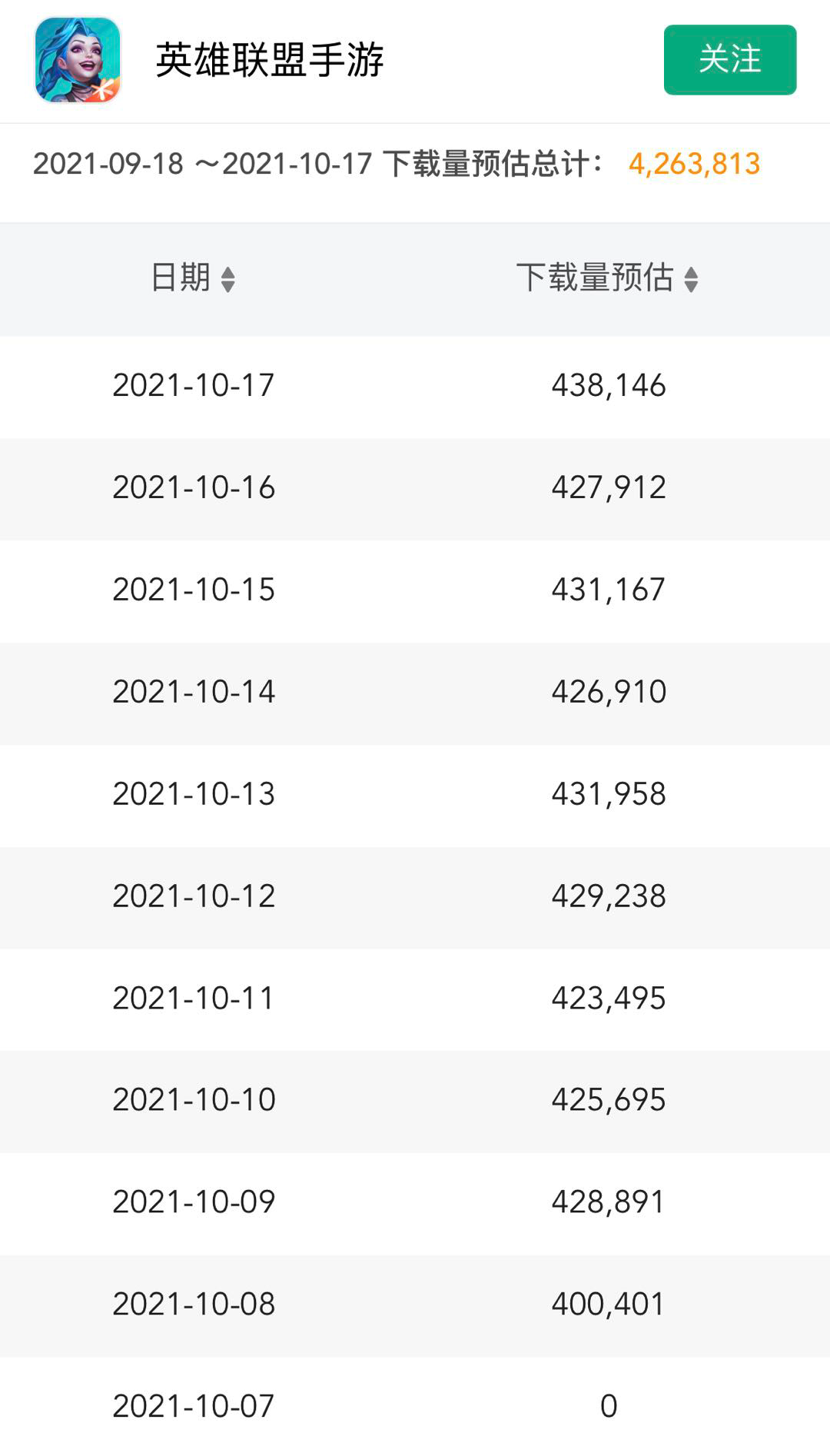 據七麥數據,LOL手遊從上線至今預估下載量426萬。