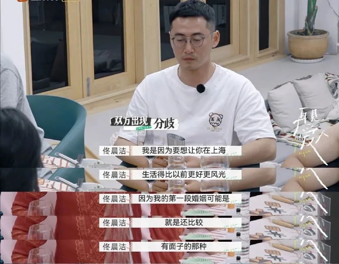 以KK和佟晨潔為例,二人的核心矛盾,就是“是否應該有一個孩子”。KK堅持希望佟晨潔生育,更深層次的原因是他在這段關係中始終缺乏安全感。在節目裏,他反覆提及自己不是上海人,是為了佟晨潔才搬到上海,在上海沒有歸屬感,經濟狀況和職業發展也不如女方,種種問題導致了他在婚姻關係中的壓力。