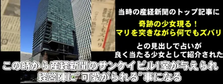 甚至日本首相福田赳夫、松下電器的社長松下幸之助都親自登門請她占卜未來。在她預言中的大事中有日本明仁天皇迎娶平民王妃;日本和美國將簽訂日美安保條約;韓國朴正熙總統被暗殺等等。