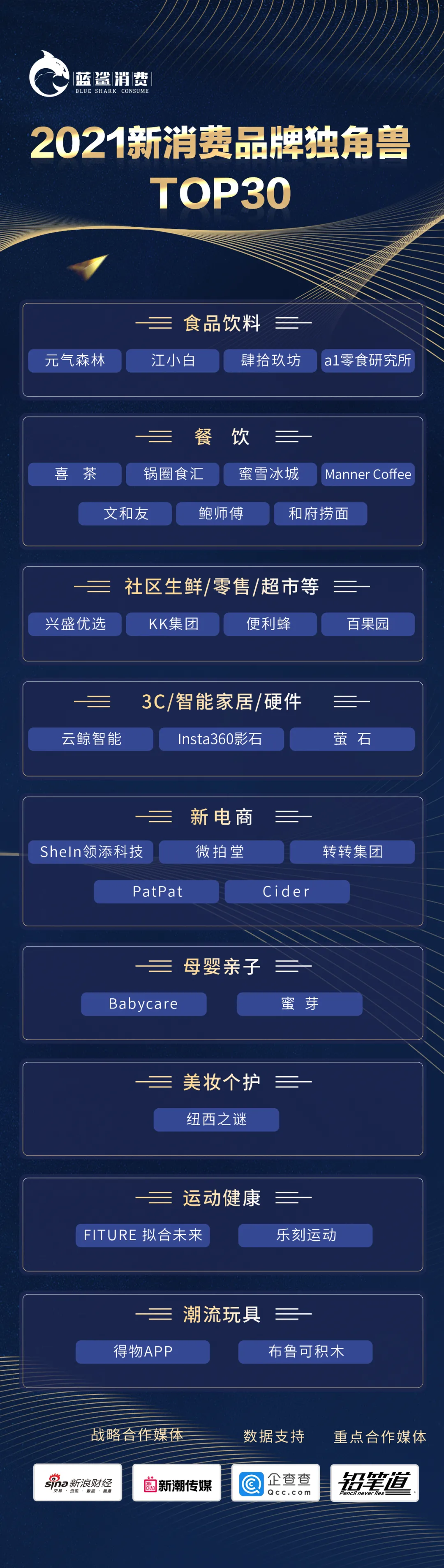 **消費行業全新圖景讓新消費品牌迎來快速發展的黃金時代。藍鯊消費以深度研究消費產業,記錄陪伴新品牌成長為使命。**為挖掘新消費品牌的領先企業,使它們成為財經商業的主流力量,藍鯊消費聯合新浪財經、新潮傳媒、鉛筆道、企查查和50+活躍的消費投資機構發起《2021 新消費品牌獨角獸TOP 30》、《2021 新消費品牌未來獨角獸TOP100》評選。