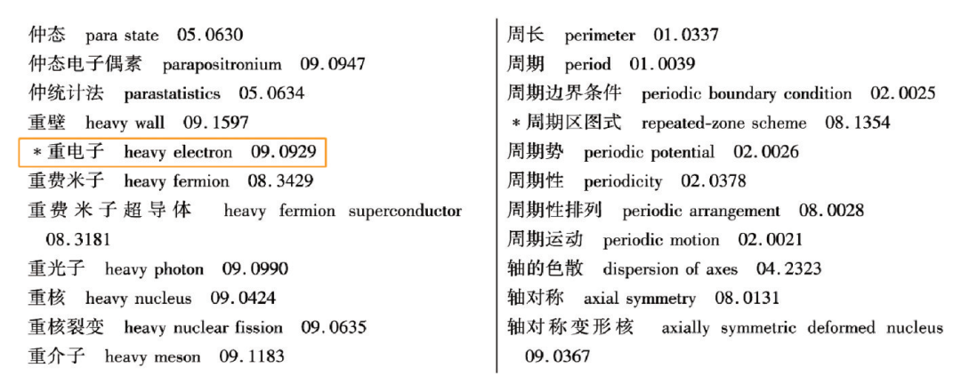 重電子也出現在索引裏。注意,接下來的兩條索引“重費米子”和“重費米子超導體”其實就是固體物理學中的重電子和重電子超導體 (但是這兩個詞條並沒有出現在這本詞典裏) 。