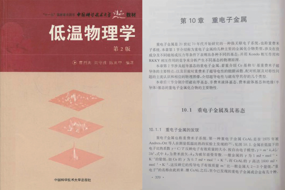 然而,重電子這個詞並沒有消失,它又出現在固體物理學裏,只是換了個身份。重電子金屬是20世紀70年代開始研究的一種強關聯電子系統,也稱為重費米子系統。1975年發現了第一種電子金屬CeAl3,低温比熱的測量結果表明,這種材料的傳導電子的有效質量比一般金屬大2—3個數量級,所以稱之為“重電子”。現在已經發現的重電子金屬或合金已經有很多種,它們的共同之處是都含有f電子殼層未填滿的稀土元素或者錒系元素,但是在低温下表現出非常不一樣的行為 (也就是説,具有截然不同的基態):長程磁有序,超導電性,非費米液體行為,近藤絕緣體,等等。在《低温物理學》這本研究生教材裏,就有整整一章的講述 (圖5)[9]。