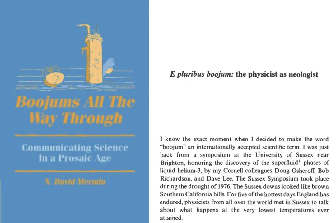 我知道一個例子,來自於莫敏 (N. D. Mermin),就是著名的Ashcroft & Mermin《固體物理學》(Solid State Physics) 的作者。他是一位理論物理學家,1976年在超流氦-3中發現了一種取向織構 (texture),可能是為了娛樂,就用boojum給它命名。Boojum這個詞連《新英漢詞典》都沒有收錄,因為它本來就是隨意編造的一個詞:劉易斯·卡羅爾在《獵蛇鯊記》(The Hunting of the Snark) 中虛構的一種怪物。莫敏使了很多手段[10],才讓這個詞出現在物理學的學術期刊上(圖6),最後居然也出現在這本《物理學名詞》裏,有了一個音義都很妥貼的中文名字——布經 (boojum)(圖7)。可是,你真的聽説過這個名字嗎?更糟糕的是,莫敏顯然已經把這個名詞又變成了動詞,他的科普散文集的書名是Boojums all the way through,難道我們把它翻譯為“全方位布經”嗎?讀者會不會以為,莫敏是個到處傳經、四方佈道的洋和尚呢?