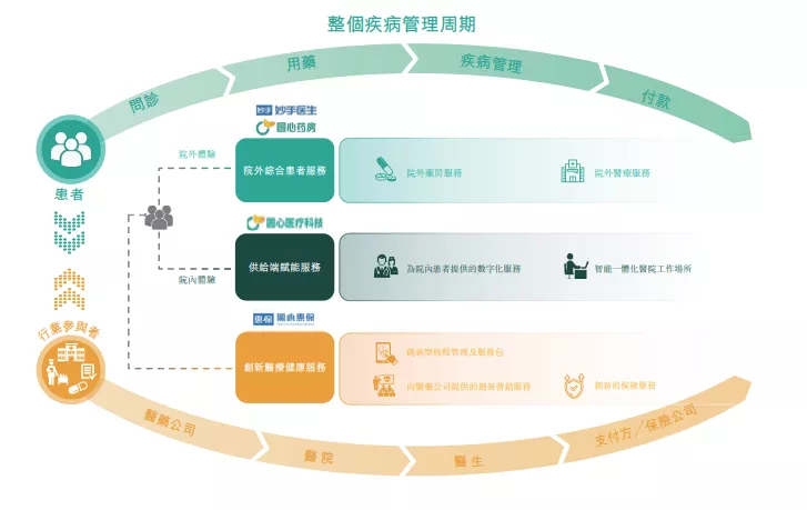 院外綜合患者服務意味着線下+線上給患者提供醫療服務。截止2021年8月31日,公司在全國30個省份以“圓心藥房”為品牌開設了251家藥房,同時結合互聯網醫療服務及藥房平台“妙手醫生”。妙手醫生是中國首批取得醫療執照的互聯網醫院之一。