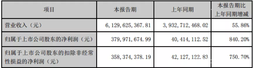 2021年半年報顯示,公司實現營業收入61.3億,較去年同期增長55.86%;實現營業利潤5.37億,較去年同期增長639.21%。