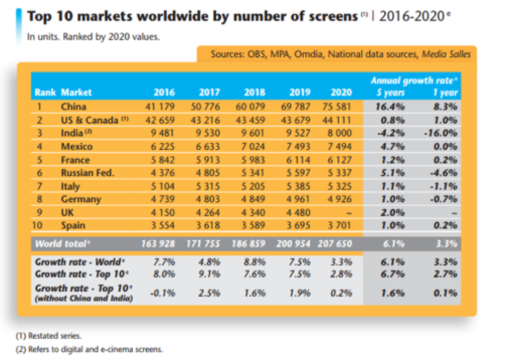 根據外媒統計,中國電影銀幕已經達到了全球的1/3。
