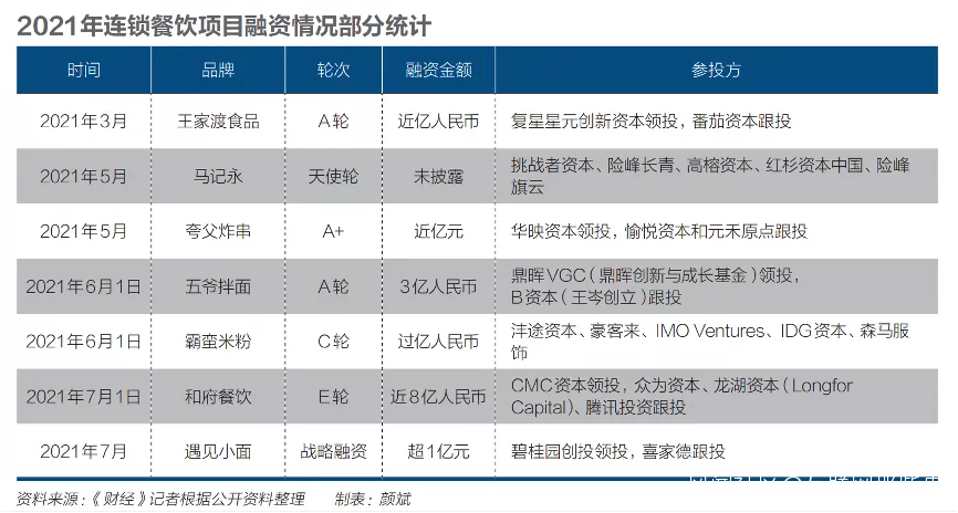 7月8日,中國餐飲品牌和府餐飲宣佈完成近8億元E輪融資。7月14日,遇見小面完成新一輪融資,融資金額超過1億元。林林總總不勝枚舉。