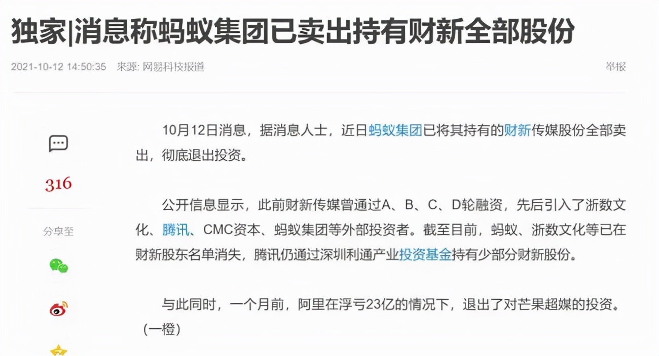 但現實並不如此簡單,近日,網易科技報道,螞蟻集團已將其持有的全部財新傳媒股份賣出。據瞭解,財新傳媒成立於2009年,是中國最有影響力的財經時政類媒體之一。螞蟻集團在2016年3月入股財新傳媒。