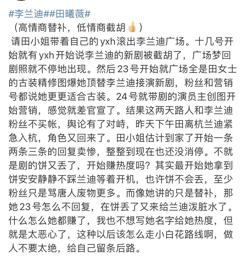 事件源於影視圈司空見慣的“截胡”套路,當事人分別是99出生的李蘭迪和97年出生的田曦薇,就知名度來説,前者是完全吊打後者的。