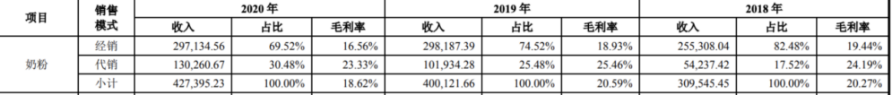 奶粉的毛利率也僅在20%左右,同樣呈現逐年下滑的狀態。其中,2020年,奶粉的毛利率僅為18.26%,同比2019年下滑1.97個百分點。