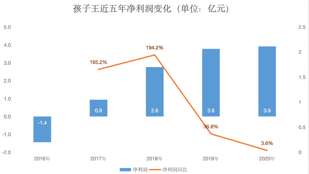 2017年,孩子王實現扭虧為盈,淨利潤大漲165%,並且在2019年再次大漲194%。2019年、2020年則處於平穩增長狀態,淨利潤同比增長36.8%、3.6%。