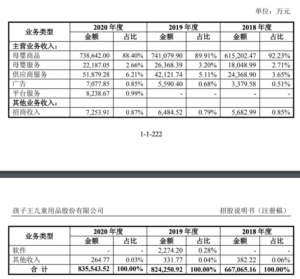 然而,穿透模式看營收,母嬰商品仍然是孩子王的主營業務來源。2018年至2020年,母嬰商品收入分別為61.5億元、74.11億元、73.86億元,佔全年營收的比例分別為92.23%、89.91%、88.4%。其中,奶粉銷售是主要來源,收入佔母嬰商品收入的比例最高。2018年至2020年,奶粉的銷售額佔當年營收的比重均在50%以上。