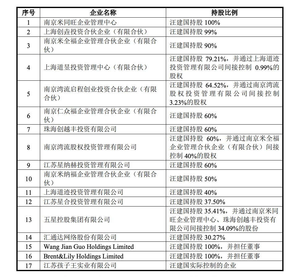 根據孩子王招股書,汪建國持股的投資企業就包括上海創垚投資、上海道昱投資管理、南京灣流啓程創業投資、珠海創越豐投資、南京灣流股權投資、江蘇星納赫投資、上海道跡投資、江蘇星合投資等。