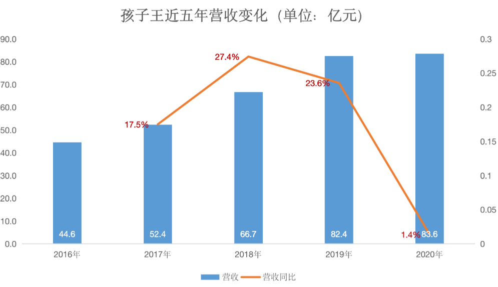 近五年以來,孩子王營收處於逐年增長態勢。2016年至2020年,孩子王實現營業收入分別為44.6 億元、52.4億元、66.7億元、82.4億元、83.6億元。五年共計實現營收329.59億元。2017年至2020年,孩子王營收增速分別為27.4%、23.6%、1.4%。