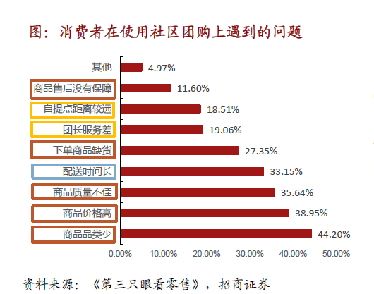 據《第三隻眼看零售》對消費者在使用社區團購過程中的問題調研,“商品品類少”是最多消費者反映的問題,其次便是“商品價格高”,可見,價格依然會是淘菜菜繞不開的那個問題。