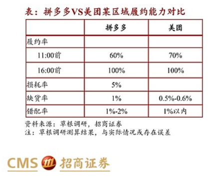 雖然從短期來看,可能提高了採購成本,但目前美團在11:00前的履約率、缺貨率、損耗率等指標均優於拼多多,長遠來看,美團的精細化管理更能通過“降本增效”來實現更低的長期成本,這一點也是淘菜菜要致力整合供應鏈條的原因之一。