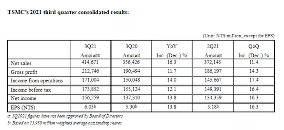 據證券時報報道,台積電10月14日下午公佈了三季度業績。三季報顯示,台積電營收4146.71億新台幣(約合951億人民幣),市場預期4135.6億新台幣,去年同期3564.26億新台幣;淨利潤1563億新台幣(約合358億人民幣),市場預期1494.73億新台幣,去年同期1373.1億新台幣;這意味着,公司每天淨賺近4億元人民幣。