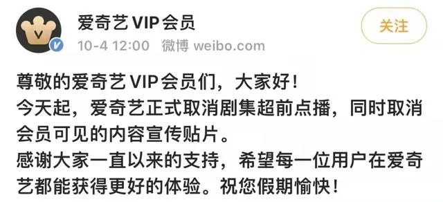 今天又跟大家見面了,最近有一個對所有的網民、劇迷,包括這種網站會員特別關注的一個話題就是愛奇藝、騰訊和優酷先後陸續公佈取消超前點播收費,這個消息一傳出來喜大普奔,網民們都在叫好,連我也跟着網民一起叫好了兩聲。那麼説到超前點播,最早可能還是因為有一些熱劇,包括《慶餘年》一出來,平台為了獲取最大限度的利益以及最大限度的關注度,包括有一點炒作噱頭,就説它可以超前點播。如果説你是會員的話,那麼你再花點錢,你可以提前比人家多看6集,當然這個花錢花的也不少,50塊錢。