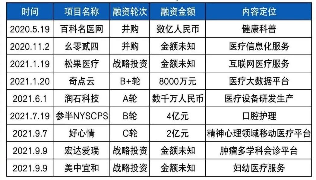 據“健康局”統計,從2020年5月到2021年9月,字節跳動在醫療領域的投資項目有9項,覆蓋健康科普、各領域醫療服務、醫療大數據等多個方面。