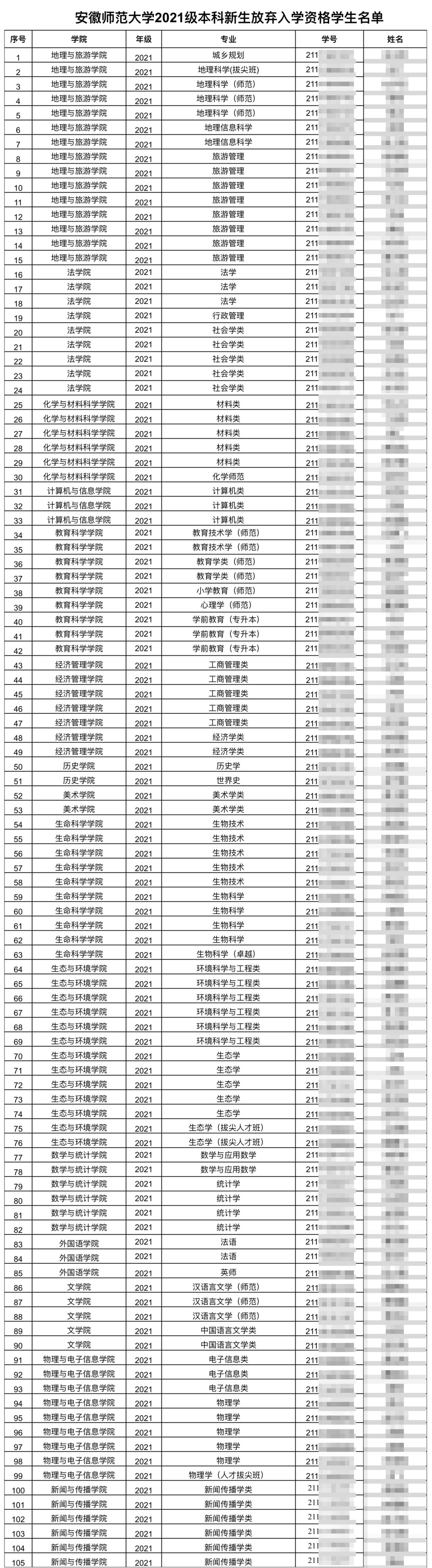 安徽師範大學公開的《放棄入學資格學生名單》顯示,這105名未按時辦理入學手續的學生,來自地理與旅遊、法學、經濟管理、生命科學、數學與統計等15個學院、33個專業,其中包括多個拔尖班。