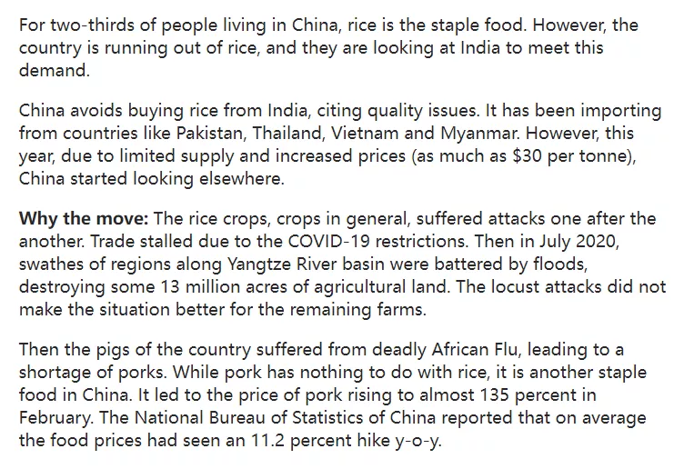 原因:水稻和其他農作物遭受了一次又一次的襲擊。由於新冠病毒,貿易陷於停頓。然後在2020年7月,長江流域的大片地區遭受洪水的襲擊,毀壞了約1300萬英畝的農田。蝗蟲襲擊並沒有使其餘農場的情況有所好轉。