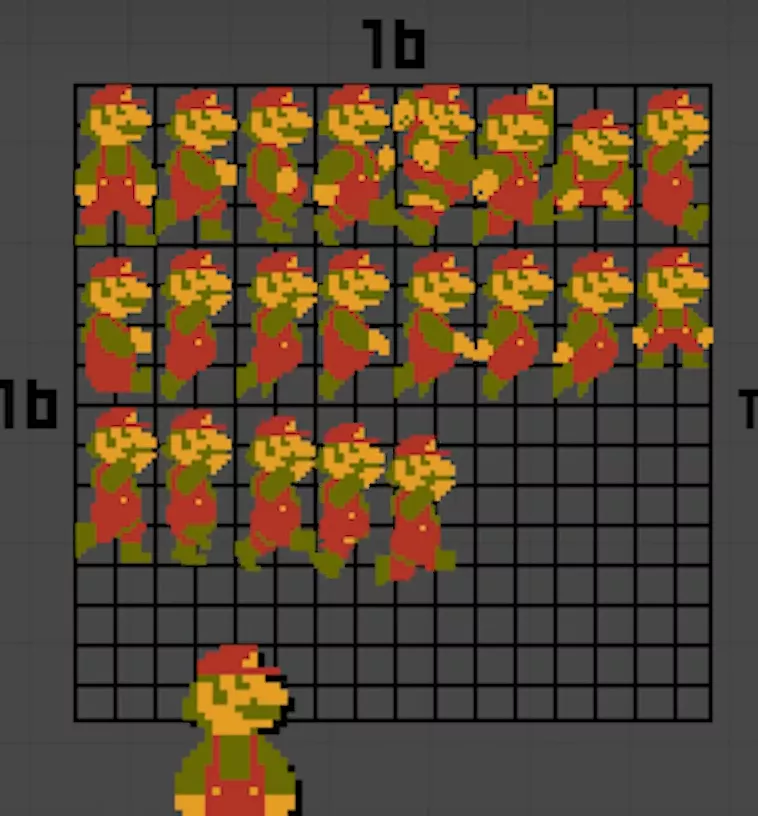 但 21 張圖片佔用空間太多,所以開發者把每張馬里奧圖片都切成了 4 份,去掉相同的部分。