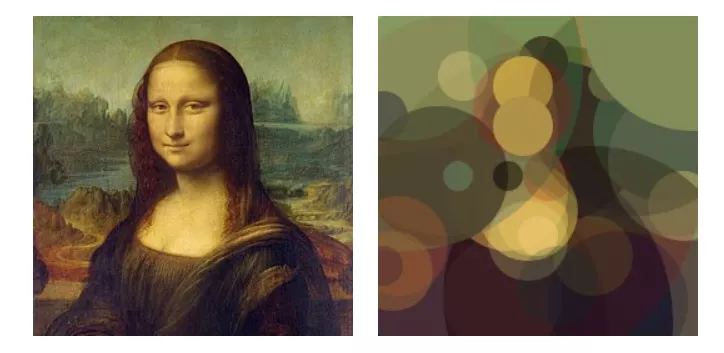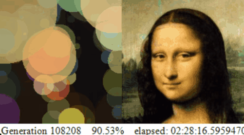 Mona Lisa approximated with 150 circles through hill climbing genetic algorithm