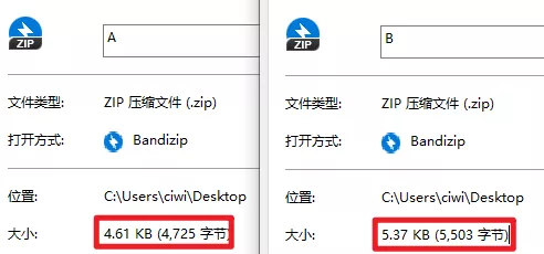 經過對比發現,雖然文件一模一樣,但是 A.zip 確實小了幾百個字節。。
