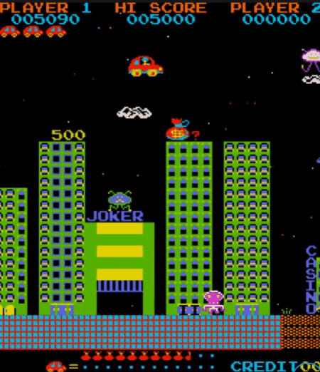 1981 年推出的《 Jump Bug 》就採用了視差滾動效果,仔細看近處的大樓要比遠處的白雲移動速度快很多。