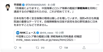 中俄海軍此番通過津輕海峽,正好被日本右翼保守勢力拿來炒作,以此轉移選民對自民黨處理國內問題不利的視線。