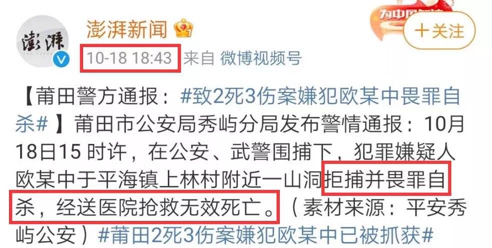 10月18日15時許,在公安、武警圍捕下,犯罪嫌疑人歐金中於平海鎮上林村附近一山洞拒捕並畏罪自殺,經送醫院搶救無效死亡。