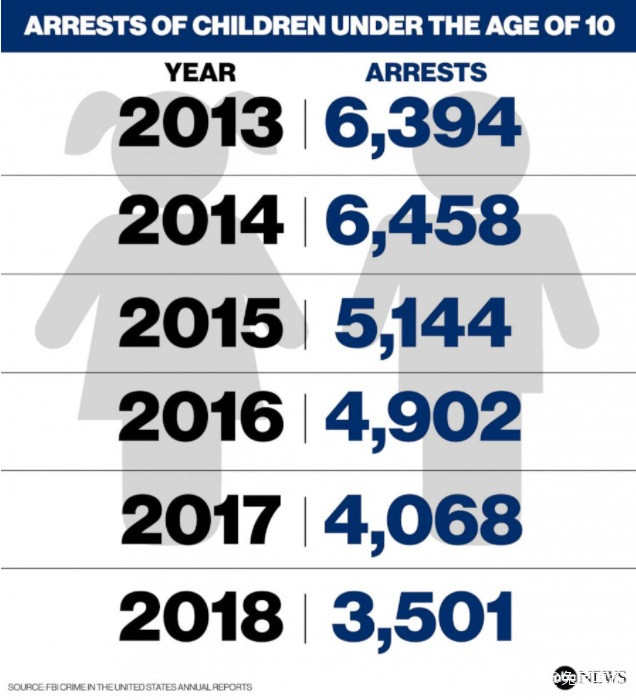 雖然聯邦調查局週一發佈的最新犯罪報告顯示,過去五年中被捕的 10 歲以下兒童人數繼續從 2014 年的 6,458 人的高位逐漸下降到 2018 年的 3,501 人,但專家表示,這一數字仍然太多。