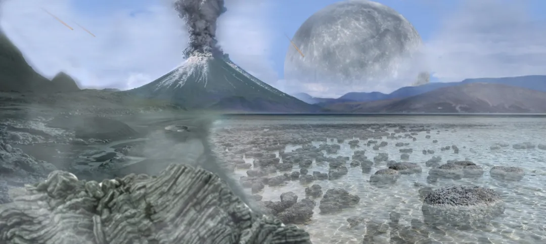 據現有理論猜測,在第一個十億年裏(4.6 - 3.8 Ga,“Ga”代表十億年,下同),地球與另一個原始行星相撞,碎片融合為月球。之後數億年,無數彗星密集地撞上新生的地月系統。這些太空髒冰塊為地球和月球帶來了豐沛的水。月球引力太小,水分很快揮發掉。龐大的地球則把這些水牢牢吸附在表面,匯為最初的海洋。在第一個十億年的最後一幕,在這最初的海洋裏,最初的生命誕生了。