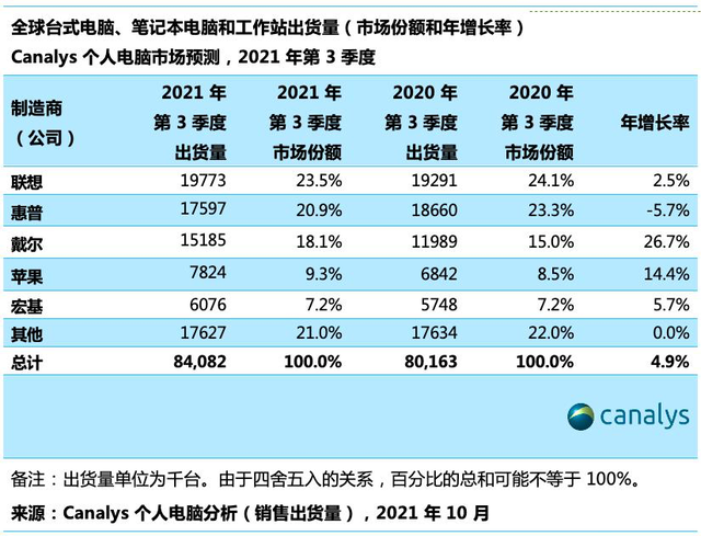 Canalys2021年三季度全球PC市場報告