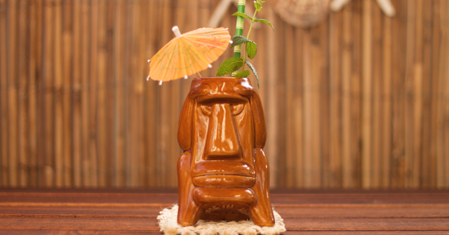 典型的TIKI雞尾酒:提基石像造型的杯子跟神秘小紙傘