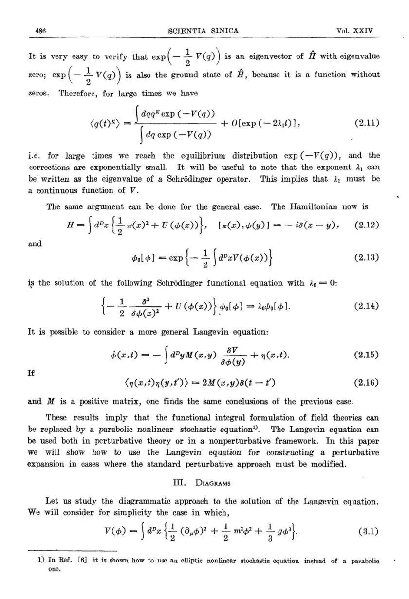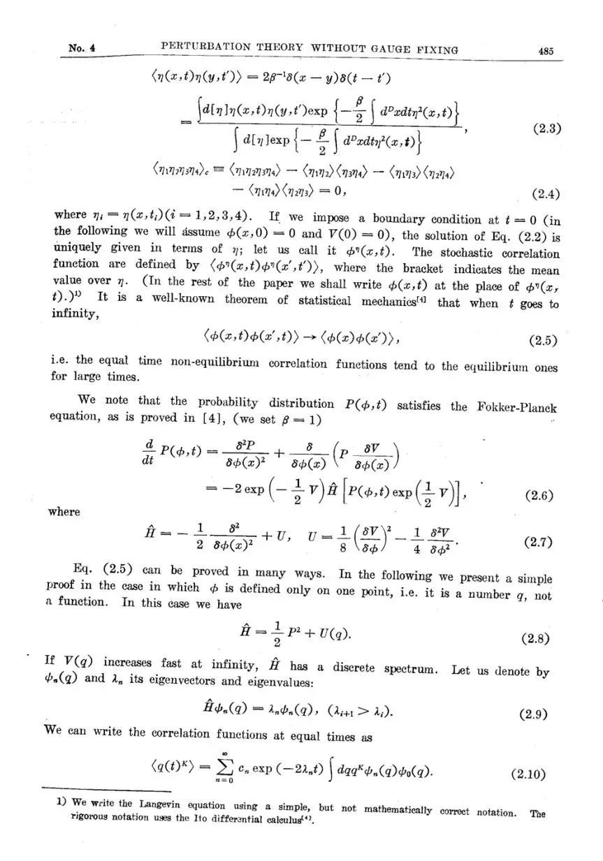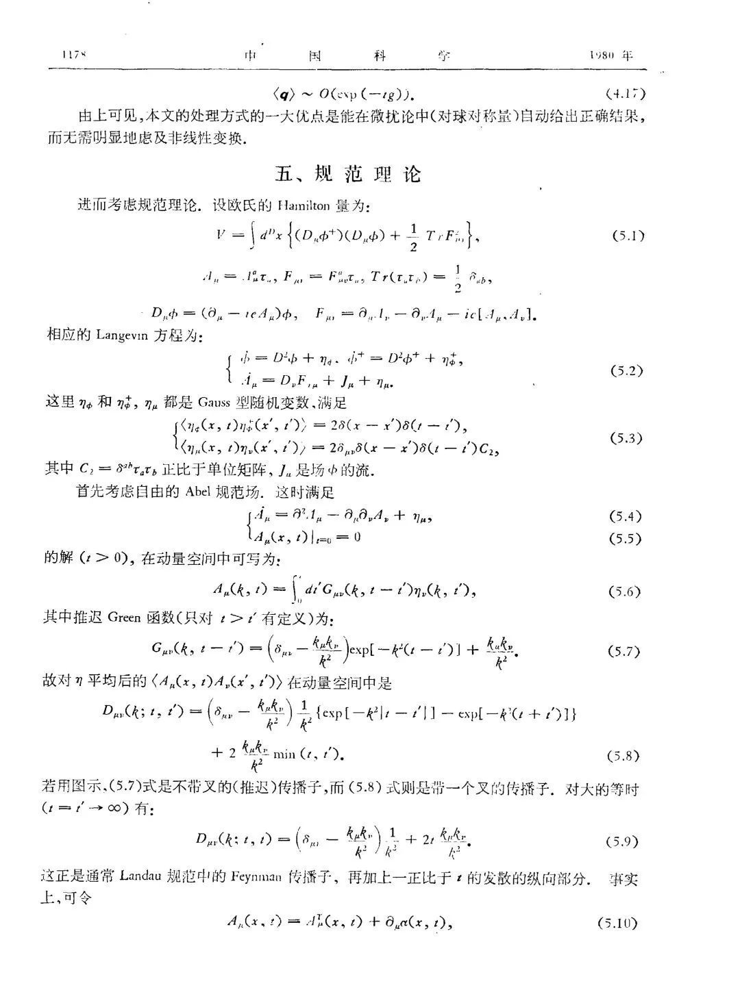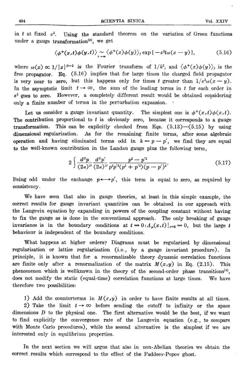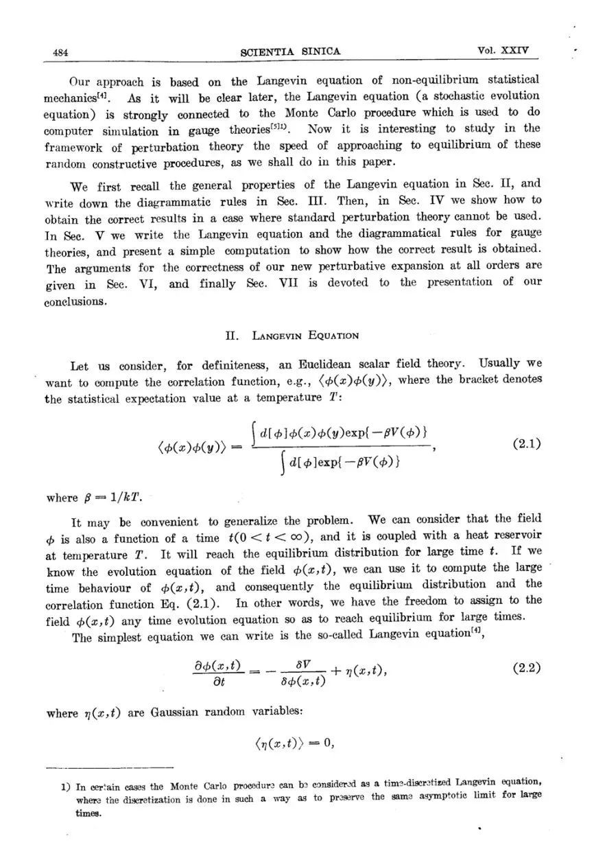 這篇論文的主要內容是從隨機過程的朗之萬方程出發,建立量子場論的微擾論展開。該方法可以應用於規範場理論,其獨特的優點是無需事先固定規範就能做量子場論的微擾論展開,正確計算規範不變的物理量。文章論及歐氏空間中量子場(特別是量子規範場)系統的漲落驅動其向平衡態的演化。而後者延拓到閔氏時空就得到物理的量子場系統的最低能量的基態。因為量子場論描述基礎理論中最為基本的系統,既可用以描寫基本粒子物理微觀現象,亦可描述凝聚態物質的宏觀量子效應,如量子拓撲物態等。所以本文出現後,引起了國際(特別是歐洲)粒子理論學界的重大反響。