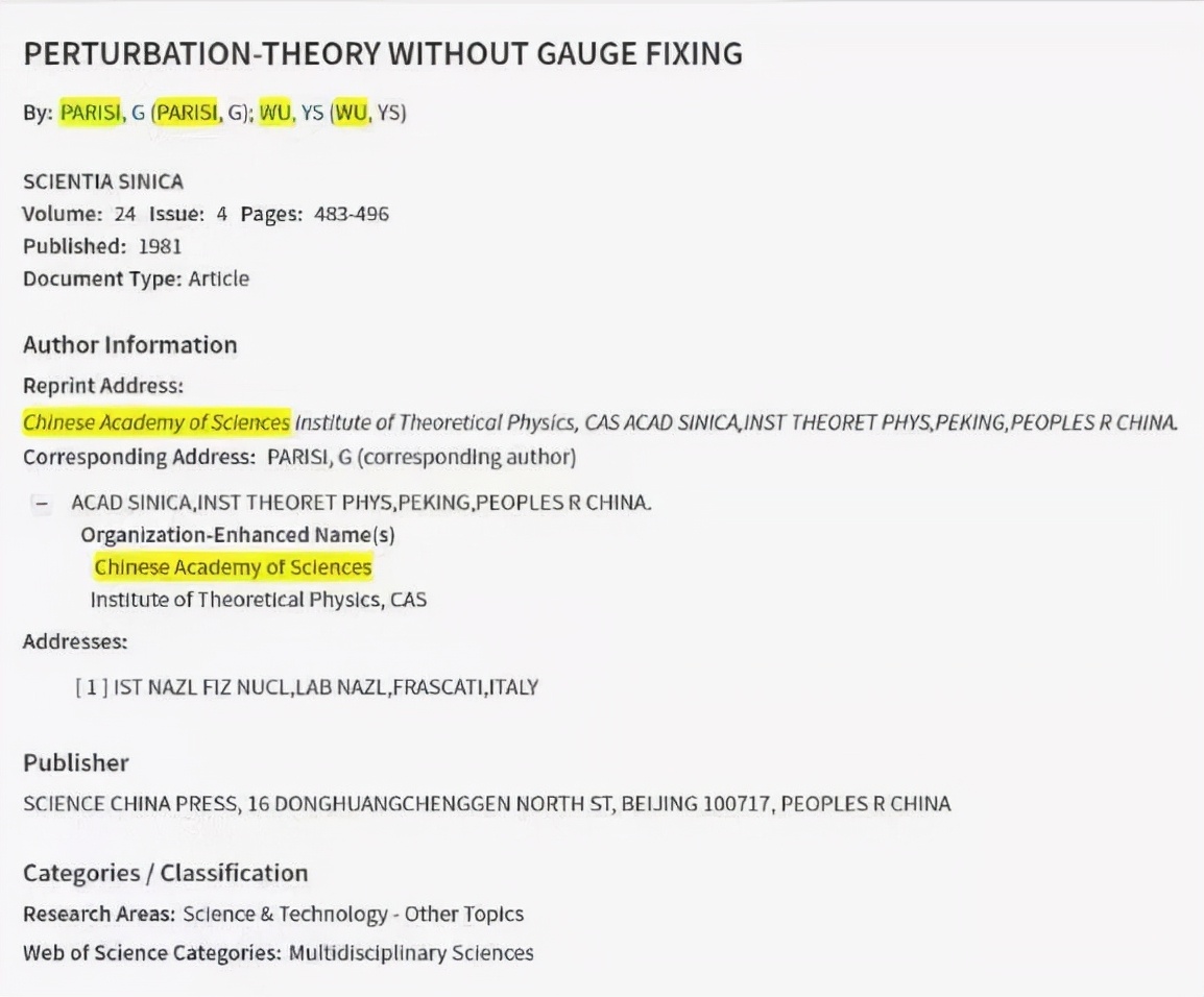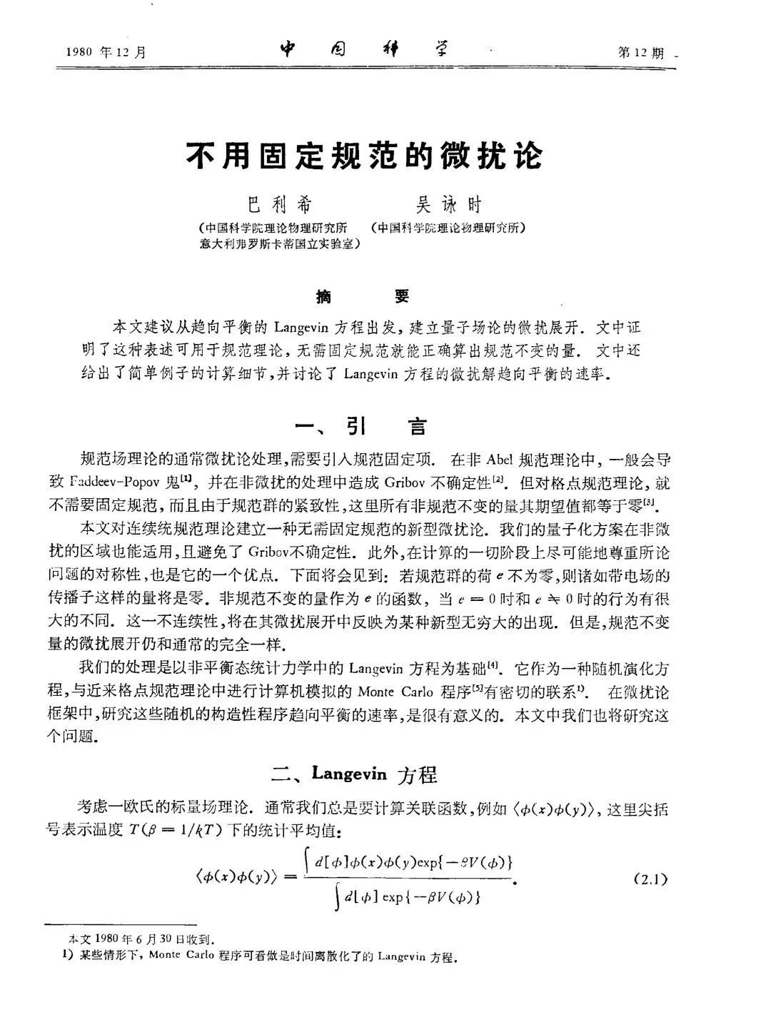 當天下午舉行的Nobel Prize Colloquium上,在介紹Giorgio Parisi的重要工作時,有一篇1981年發表在《中國科學》期刊上的論文引起了我們的注意。論文作者為Giorgio Parisi和Wu Yongshi(吳詠時),論文題目是《Perturbation Theory without Gauge Fixing(不用固定規範的微擾論)》,論文的第一完成單位為中國科學院理論物理研究所。