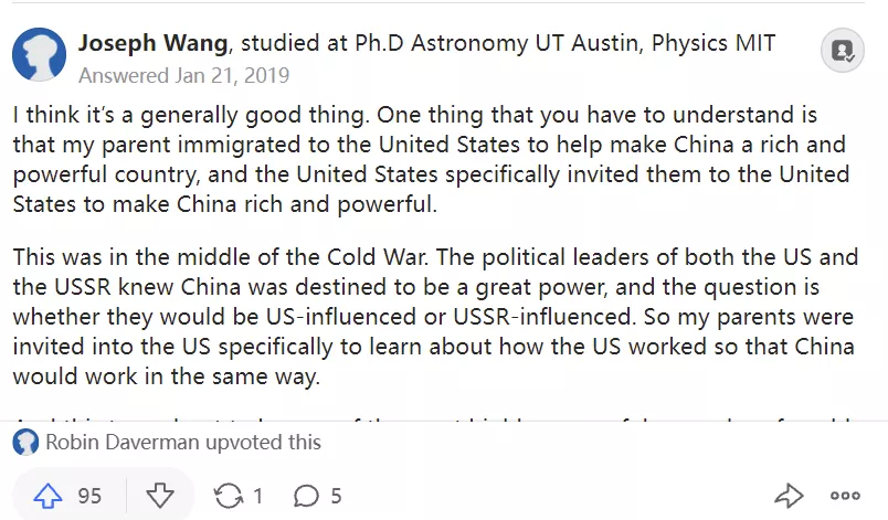 我認為這總體上是一件好事。你必須瞭解的一件事是,我的父母移民到美國是為了幫助中國成為一個富強的國家,而美國特別邀請他們到美國是為了使中國富強。
