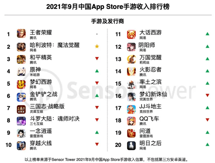 APP Annie在9月指數中暫未公佈中國iOS遊戲收入榜和下載榜,因此本期手遊矩陣採用Sensor Tower最新發布的《2021年9月中國手遊發行商全球收入排行榜》作為補充。