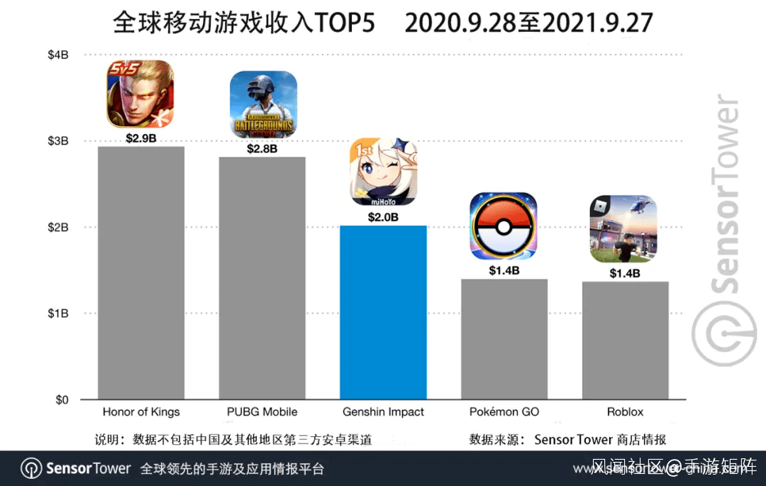 上線一年時間內,《原神》全球收入超過20億美元,吸金力同期位列第3