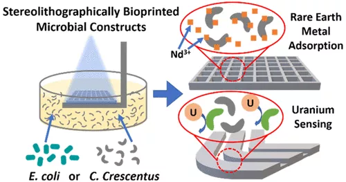 在一組實驗中,研究人員比較了不同生物印刷圖案中的稀土金屬回收情況,顯示在三維網格中印刷的細胞可以比在傳統的散裝水凝膠中更快地吸收金屬離子。此外,該團隊還打印了活體鈾傳感器,與對照打印相比,觀察到工程細菌的熒光增加。